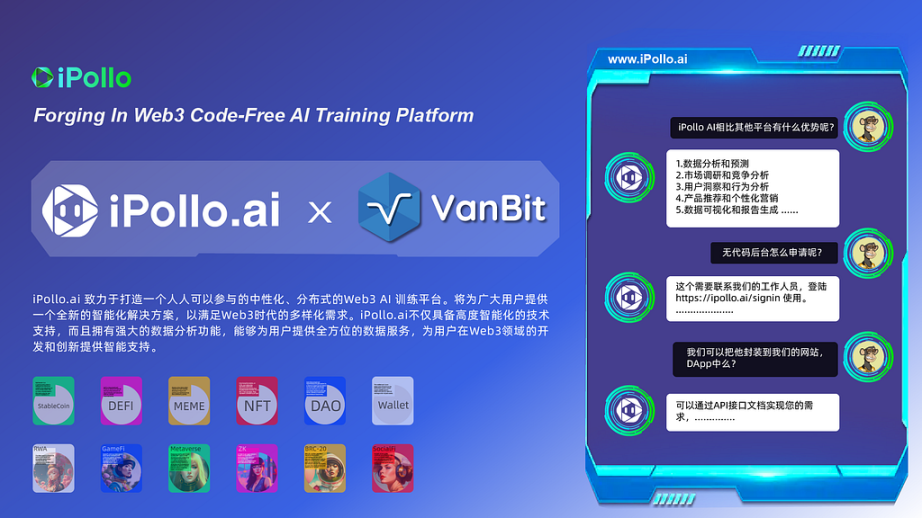 近日,Web3 无代码可训练平台 iPollo.ai 与区块链科技公司 VanBit 宣布达成了战略合作协议,将通过运用 iPollo 独创的 AI 分析系统 iPollo.ai,以及 VanBit 全面、准确的数据,合作推出一款全新产品“AI 数据报告”,为 VanBit 的加密货币交易工具平台赋能。