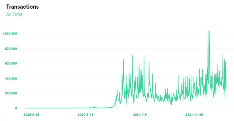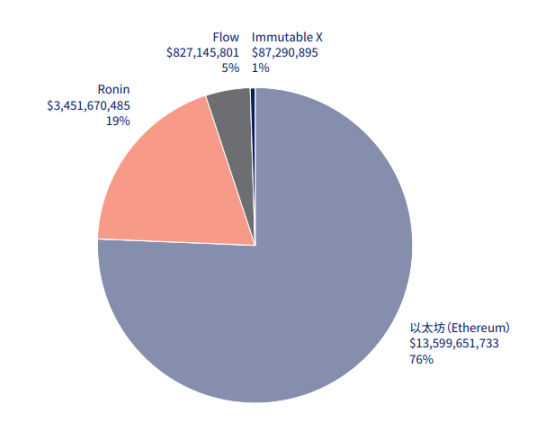 交易金额方面,对比几个主要的NFT区块链之间的交易量,截至2021年12月31日,可以看到以太坊占据着最大的市场份额,Ronin凭借AxieInfinity排名第二,Flow占比约为5%。
