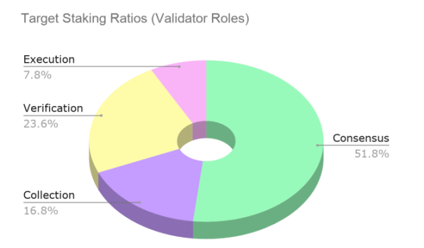 质押保证金:指的是验证人节点锁定一定数量的FLOW代币作为保证金,以作为负责网络运行的基础设施的一部分。不同类型的节点,获得的代币奖励比例不同。具体如图4-3所示,可见,共识节点的质押奖励比例最高,因此,也吸引了最多的质押节点参与。