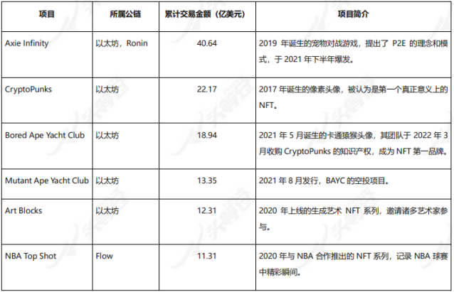 在市场行情火热的情况下,也形成了一批头部NFT项目,获得较高的流动性。从表5-2可知,NFT累计交易金额前六大项目(市场)的情况。目前,以太坊在该榜单上占据主要地位,但是,Ronin、Flow也都形成各自的NFT品牌,NBATop Shot的累计交易总额位于成交量的第六名,但交易次数位于第一,多达1,900万次。NBATop Shot 是消费级应用,更多玩家是出于消费心理购买,具备经济上的普适性,定价不会太高,但活跃度较高。
