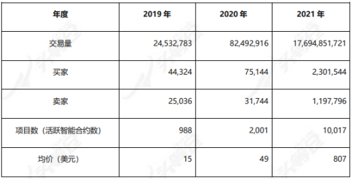 从表5-1可知,NFT行业在2021年度,从交易量、买家、买家、项目数以及交易均价方面,都出现了爆发式的增长。市场交易总额增长了200多倍,买家增长了约30倍,卖家增长了36倍,项目数增长了4倍,均价增长15倍。
