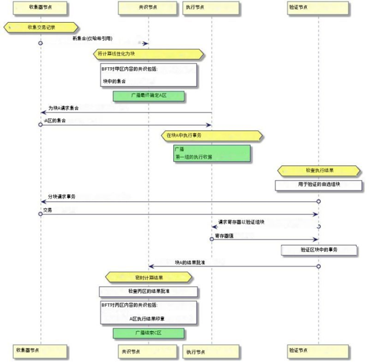 收集节点将交易数据打包给共识节点,共识节点达成BFT共识后,交给执行节点进行运算,再由验证节点对执行结果进行验证,最后发布结果,让共识节点完成封装入块,并进行广播,开启下一个区块。