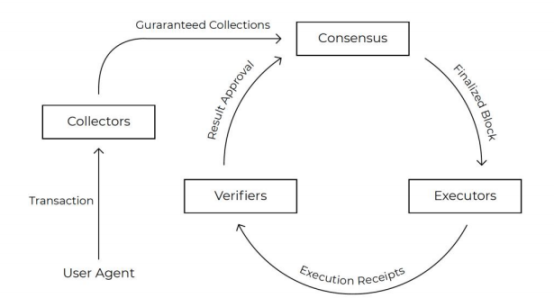 Flow网络架构的核心点在于将交易划分为非确定性任务和确定性任务,即共识和计算分离,让拥有极大算力的节点不必因等待共识结果而停滞运算,而是一直保持运行过程,让算力充分发挥出来,在配合其他不同功能的节点来实现网络性能的高速化。