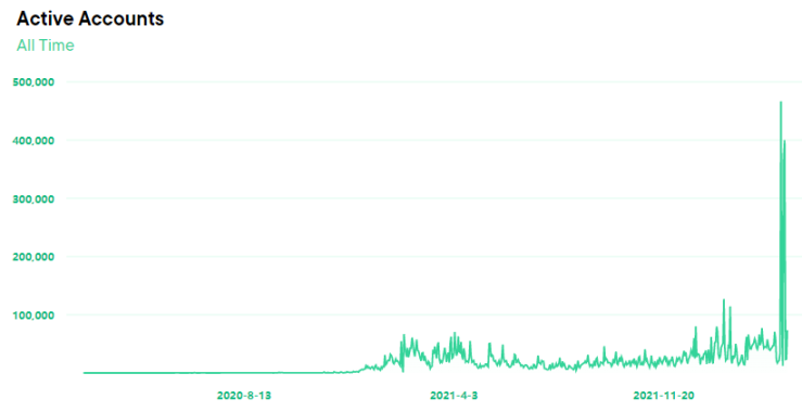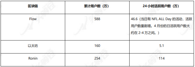 以太坊上的NFT主要流量在Opensea上,Ronin的NFT主要流量在AxieInfinity上,因此采用这两个市场的数据来进行对比分析。截至2022年4月29日,用户数对比如下表所示: