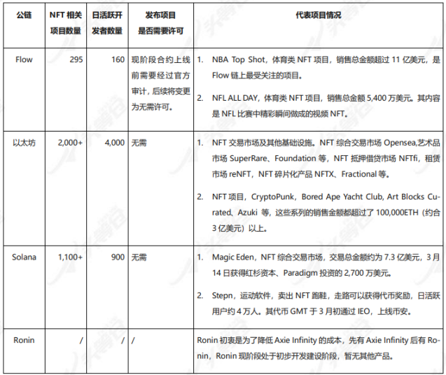 目前,NFT领域的竞争激烈。除了上述几个较为强势的公链外,各公链也都在发展自己的NFT品牌,各有侧重。如Solana、BSC、Wax、Chromia、IMX等专注于区块链游戏发展,从而顺势推出与游戏资产关联度较高的NFT交易市场。Tezos主要专注于小众艺术家作品的NFT市场建设。在以太坊上,也存在着诸多市场和项目的竞争。