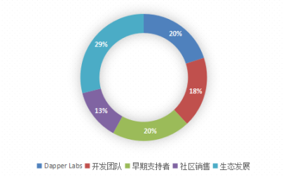 代币分配为5个部分:早期支持者(20%);社区销售(13%);团队发展(18%);生态发展(29%);DapperLabs(20%)。如下图所示: