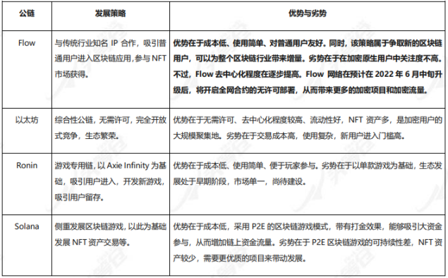对于NFT领域,不同的公链,结合自身的特点,选择了不同的发展策略。部分公链属于综合型公链,以DeFi作为开端,提供高收益的流动性挖矿项目,吸引资金进入;同时,开发NFT市场,吸引资金进入NFT。部分公链属于专用型公链,如专注于游戏或者NFT资产,其一开始从热点的游戏或者NFT项目作为契机,吸引用户进入和留存的。在NFT市场拓展方面,主要的几个公链发展策略对比如下: