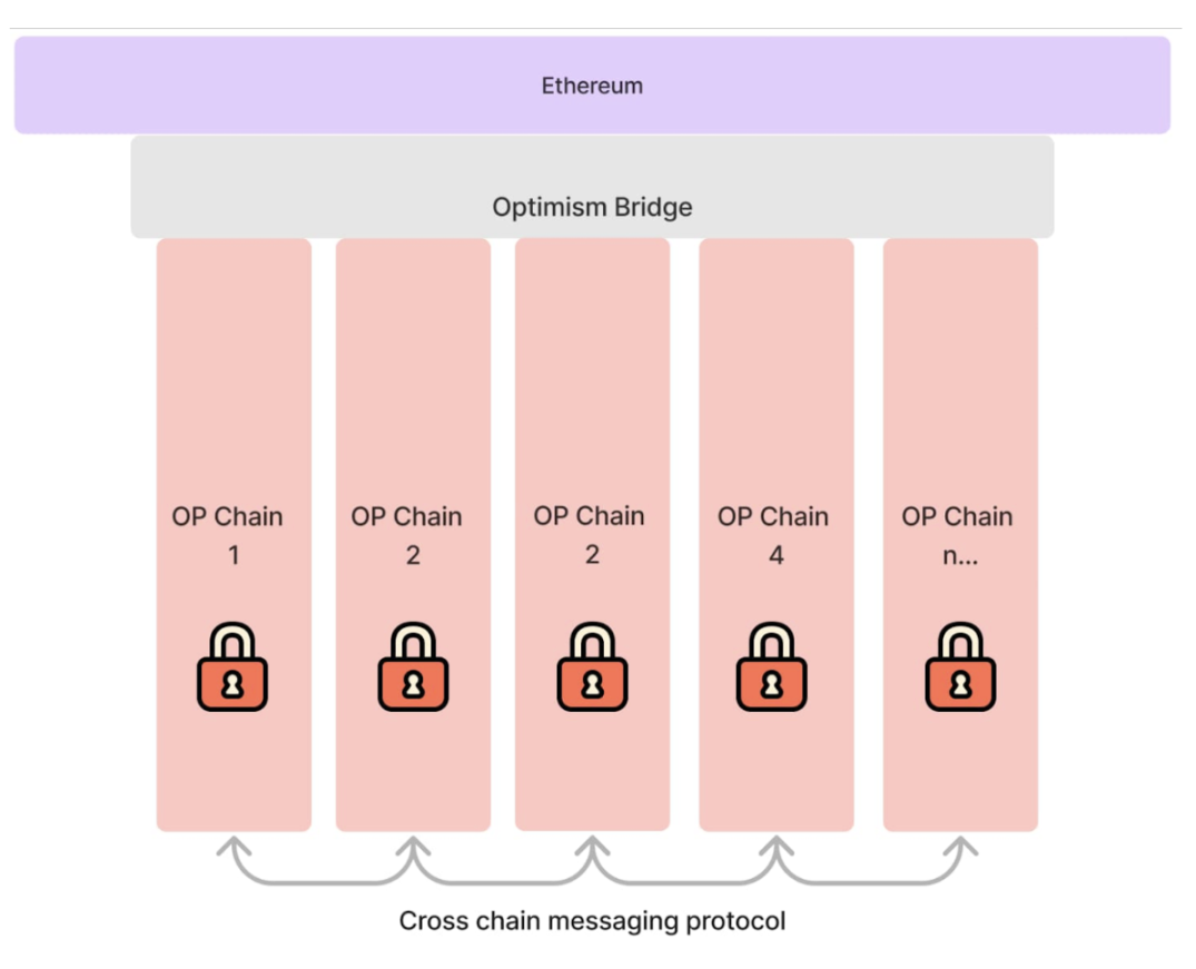 本质上而言,如上图所示,超级链是一个横向可扩展的区块链网络,各链之间共享安全性、通信层和开发套件。OP Stack 将是超级链背后的模块化开发堆栈,而超级链之内是无数可相互链接、可通信的区块链。