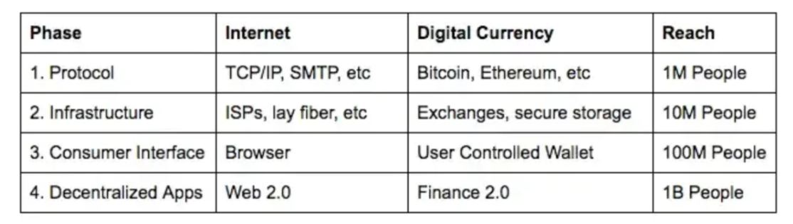 如上图所示,公司的创始人布莱恩·阿姆斯特朗(Brian Armstrong)提出了一项总体规划,将加密货币的增长概述为四个阶段。这些包括: