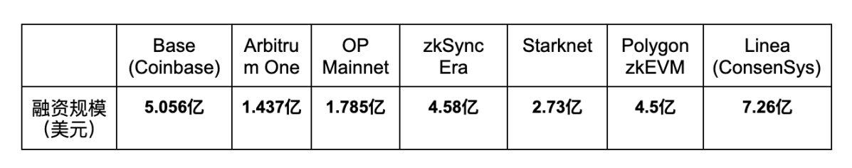 除此之外,其他的 Layer2 项目也获得了可观的融资:Arbitrum One 获得了 1.437 亿美元,OP Mainnet 获得了 1.785 亿美元,zkSync 获得了 4.58 亿美元,StarkNet 获得了 2.73 亿美元,Polygon zkEVM 获得了 4.5 亿美元,此外,需要注意的是,Linea 与 Base 一样并未进行单独融资,但其背后公司 ConsenSys 获得 7.26 亿美金的融资。