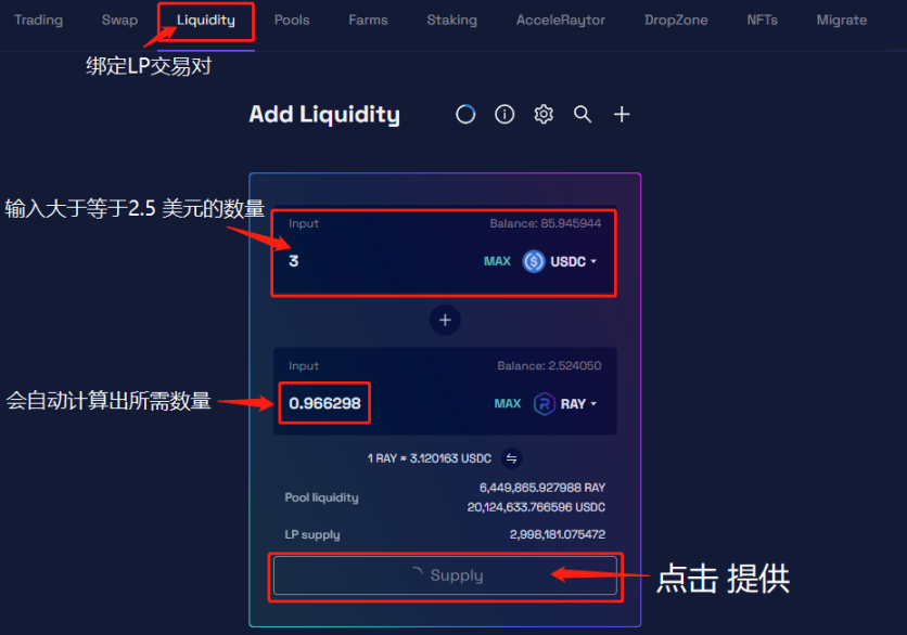 首先点击上方的 “Liquidity” 提供流动性,按照任务要求需绑定≥ 5美元的交易对,然后选择USDC-RAY 交易对,输入≥ 2.5 美元的USDC。最后点击 “Supply” 提供流动性并在钱包内确认此笔交易即可。