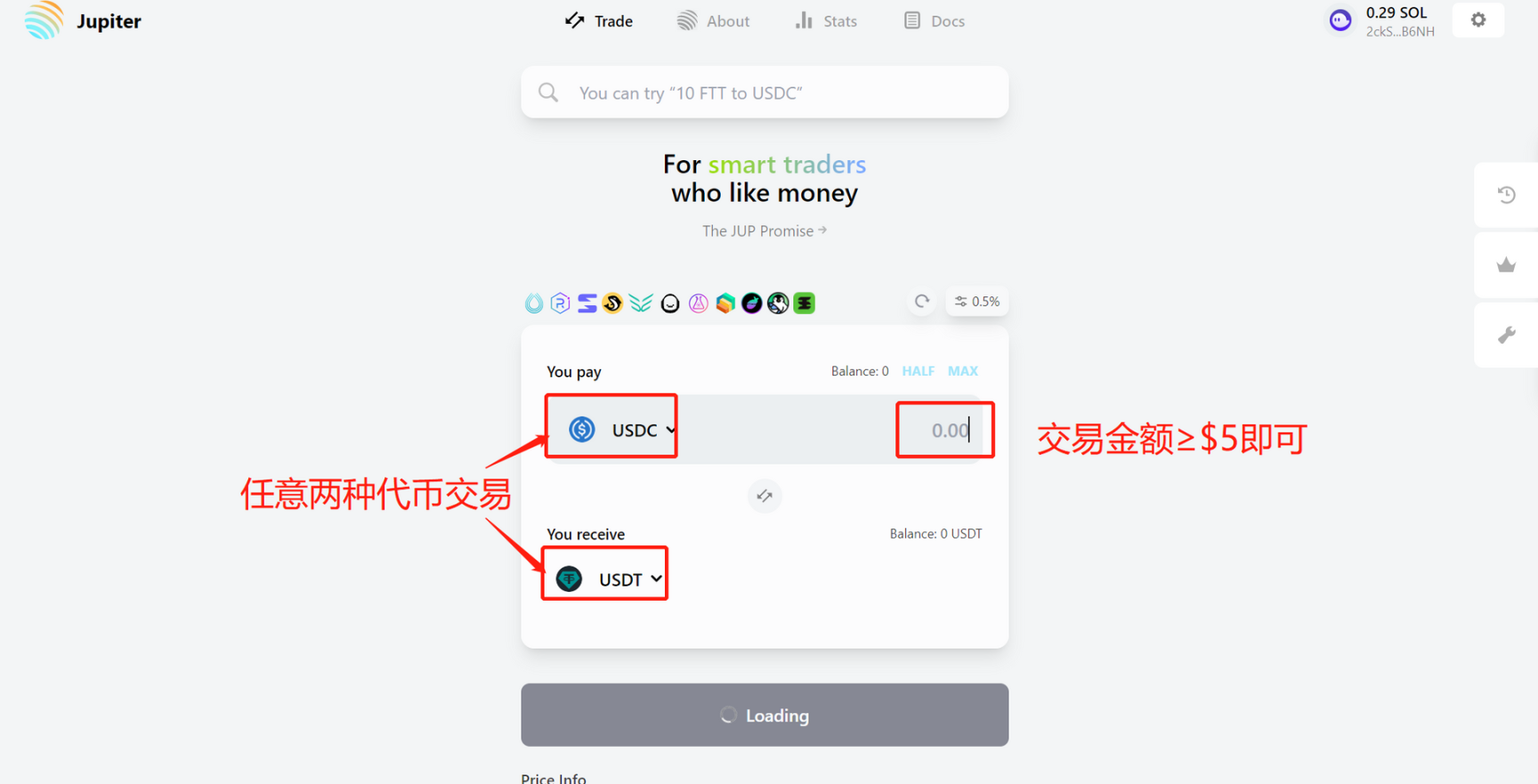 可点击 Juptier 上,在 Juptier 平台上用任意货币对交换(最低 5 USDC或等值)