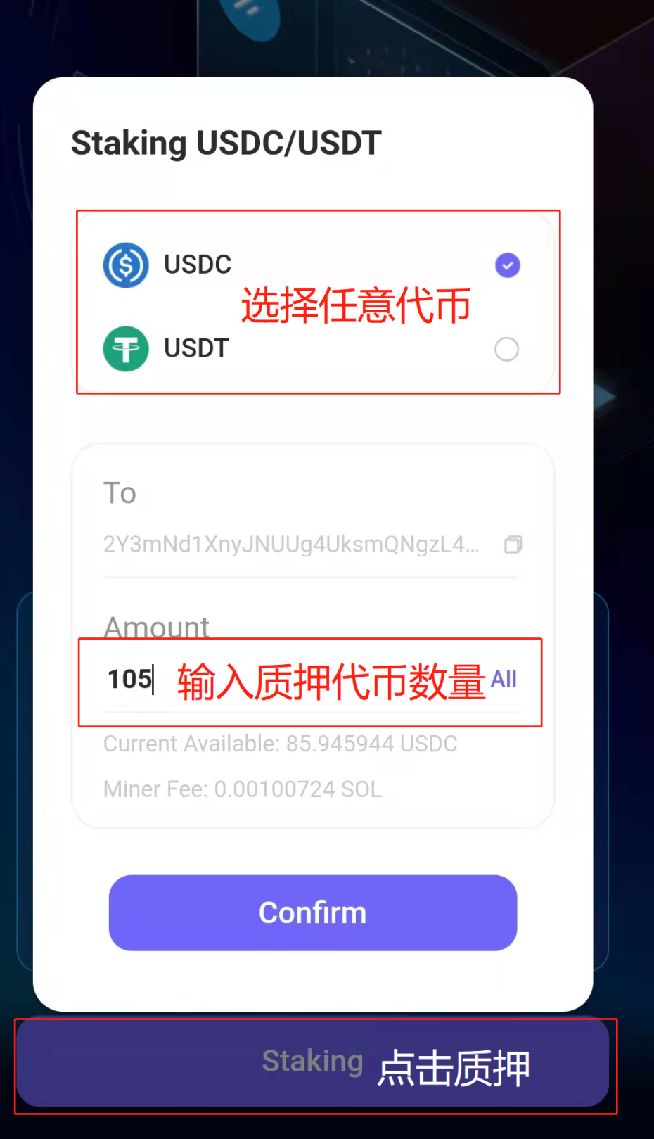 4. 点击 “Staking”,输入≥$100 的 USDC/USDT 代币,确认质押交易即可。