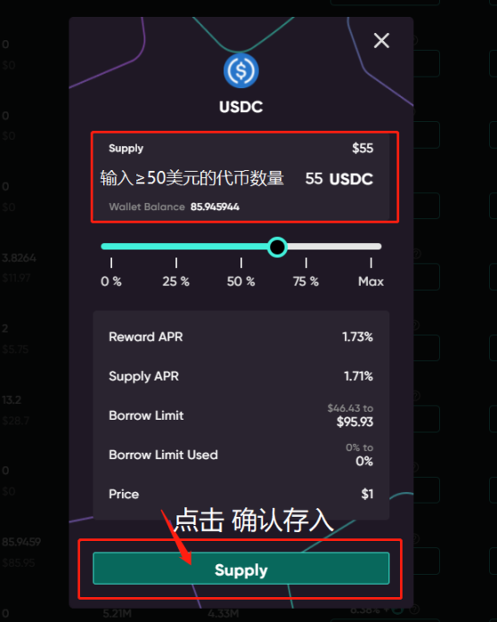 1. Lend中存储50\(或以上,任意选择一种代币进行存储(例如:55 \)USDC )点击Deposit 的选项,输入代币数量并在钱包内确认此笔交易即可。