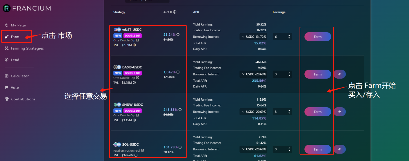 📌任务描述:在 Francium 平台上开一个至少 120 美元的头寸,用 40 USDC 开一个3倍头寸或其它相当于 120 美元的代币也算在内。