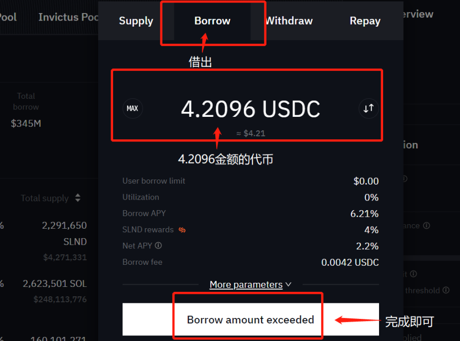 3. 最后一步需要准确的借出 $4.2096 金额的USDC或者USDT即可。