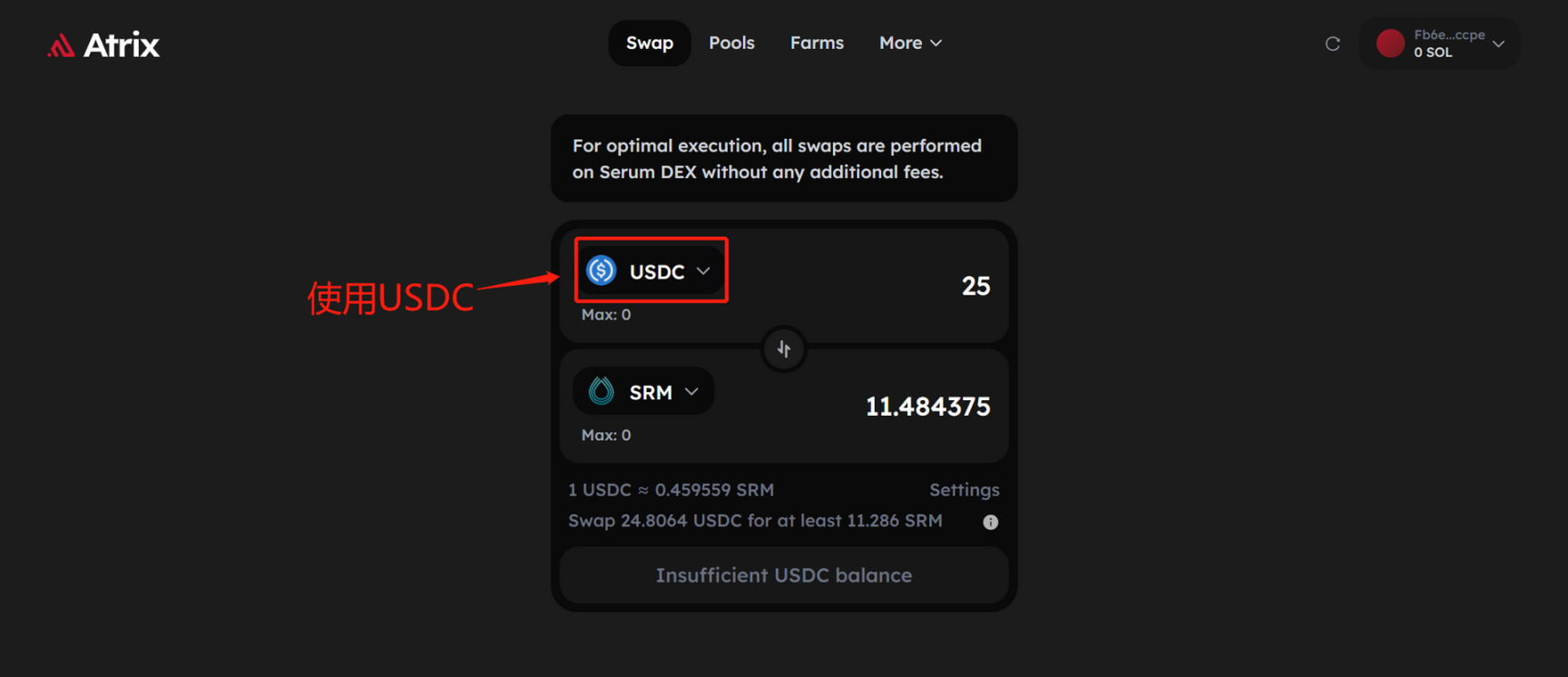 📌任务描述:在 Atrix Finance 上用 USDC 购买至少 25美元的 $SRM 代币。
