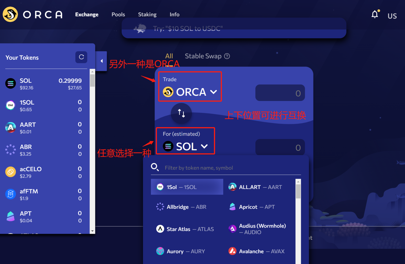 - 在 Orca 上交换任意带有ORCA代币的货币(最低5美元或等值)