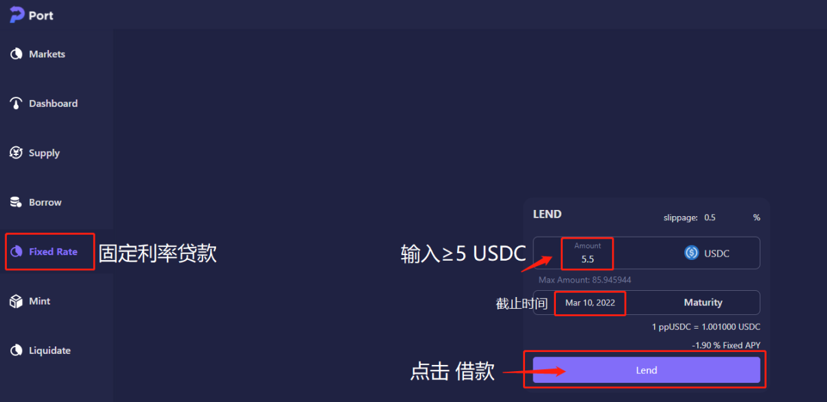 - 在 Port 的 Fix Rate(固定利率)贷款产品上至少借出 5 USDC