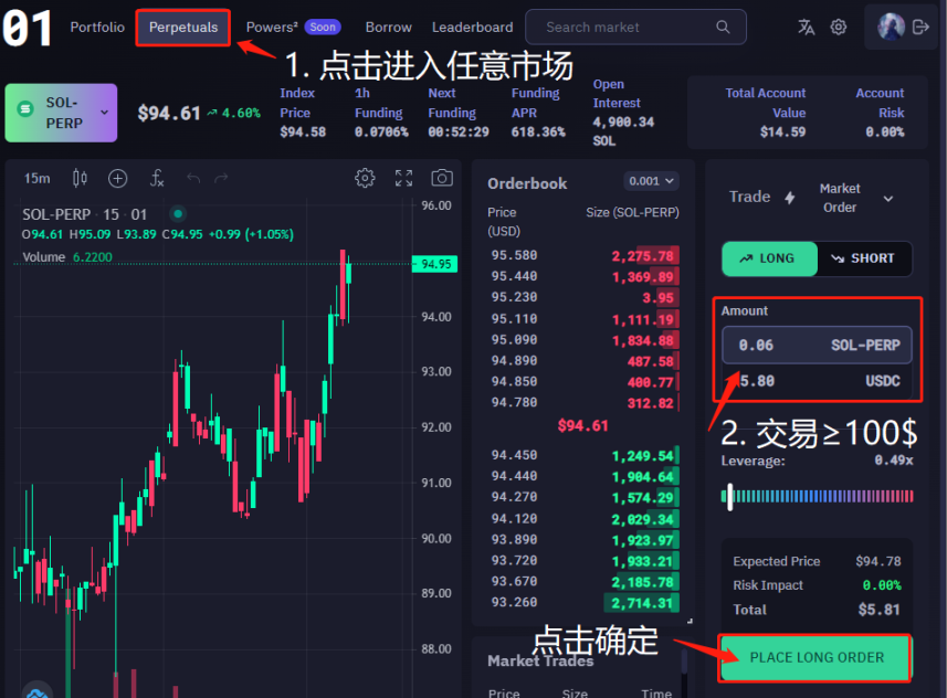 2. 交易确认后,选择任意市场进行交易(例如:Sol-Perp)交易价值需要≥150 美元。随后在钱包中确认即可。