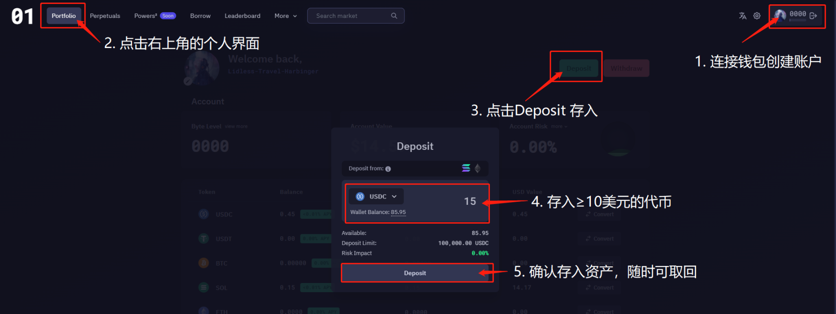 1. 进入界面后,首先连接钱包,点击右上角的“Deposit/Withdraw”一次性存入≥150 USDC代币。