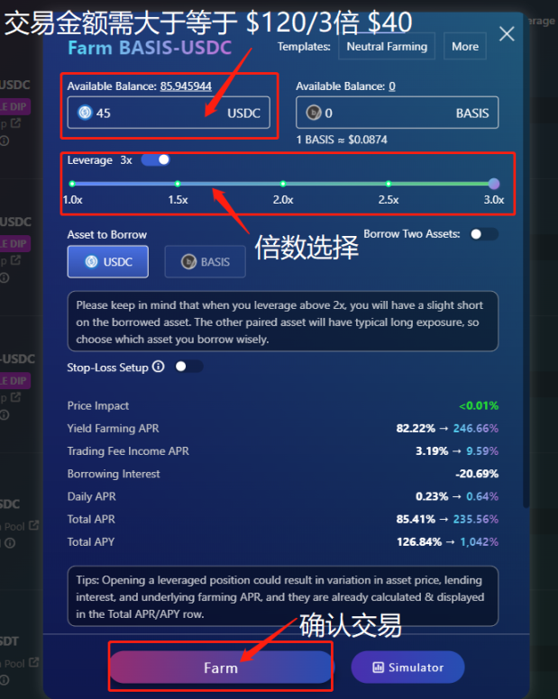 2. 点击任意交易对后,按照要求输入相应数量的代币,可选择单一的\(120 资产,或者3倍的\)40的资产。