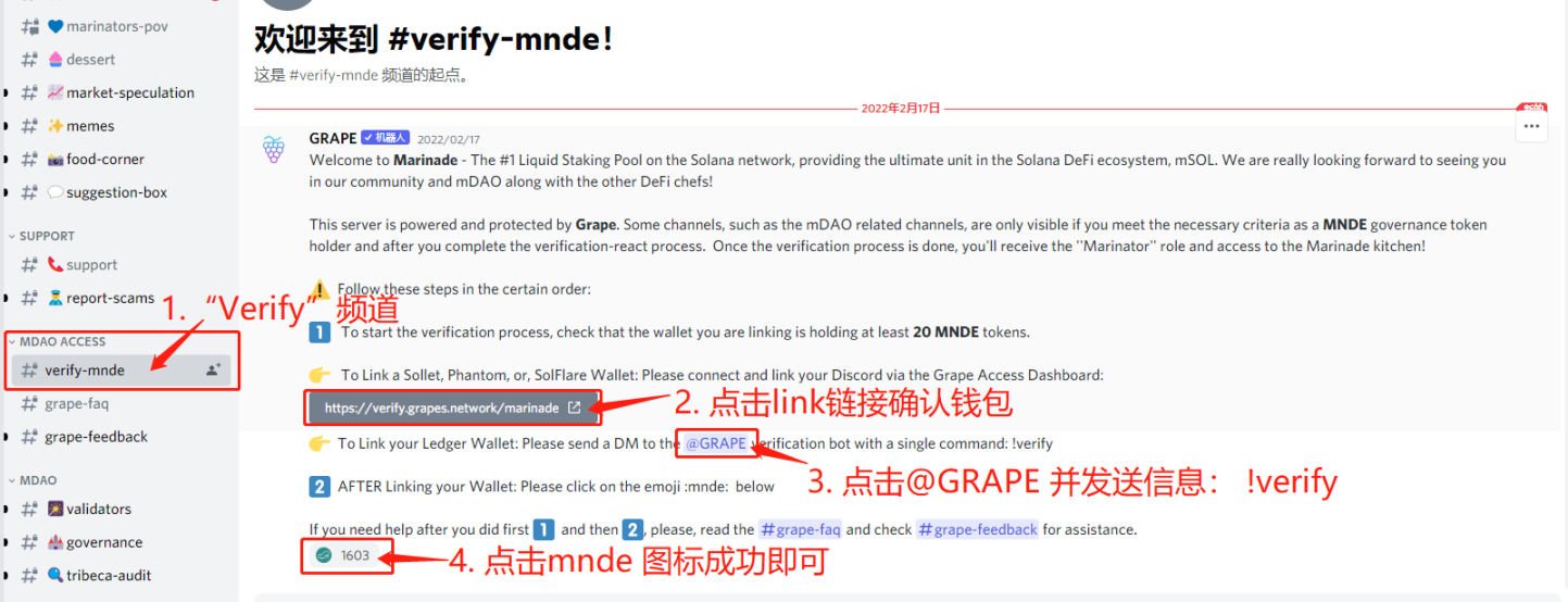 2. 加入 Marinade Discord社群 ,并在 verify-mnde 频道中验证钱包,确认是否持有至少 20枚$MNDE 代币,验证成功后将获得 Discord 社群中的 Marinator 角色。