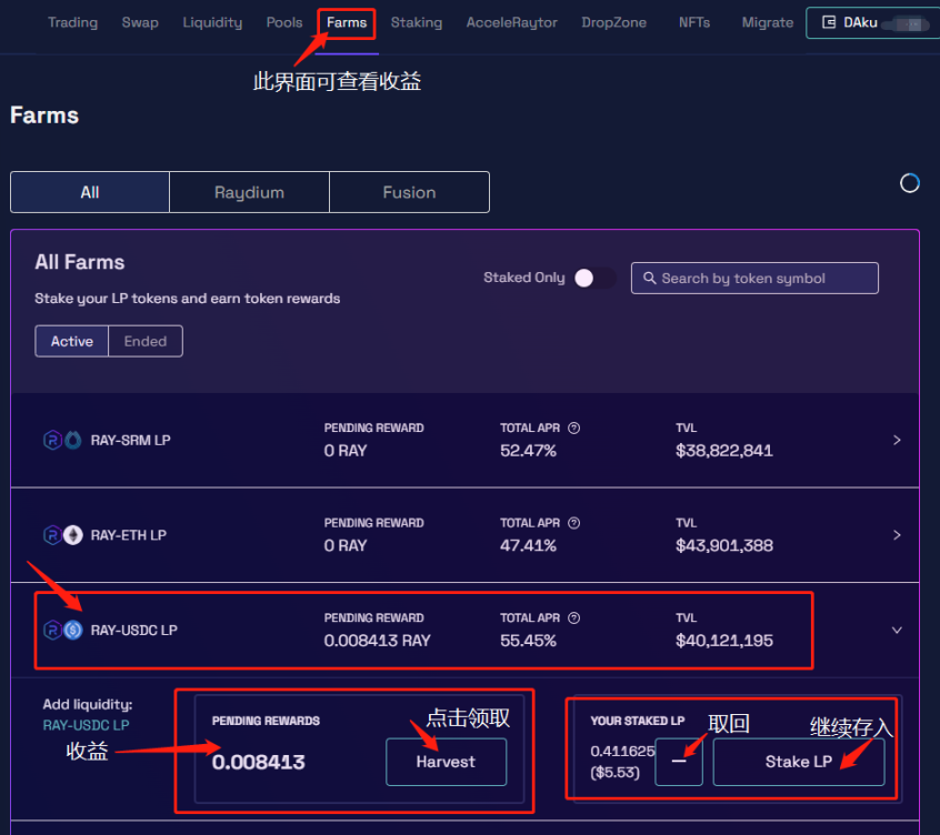 提供流动性的收益可点击“Farm”查看,选择 USDC-RAY 交易对,即可领取/查看 收益。