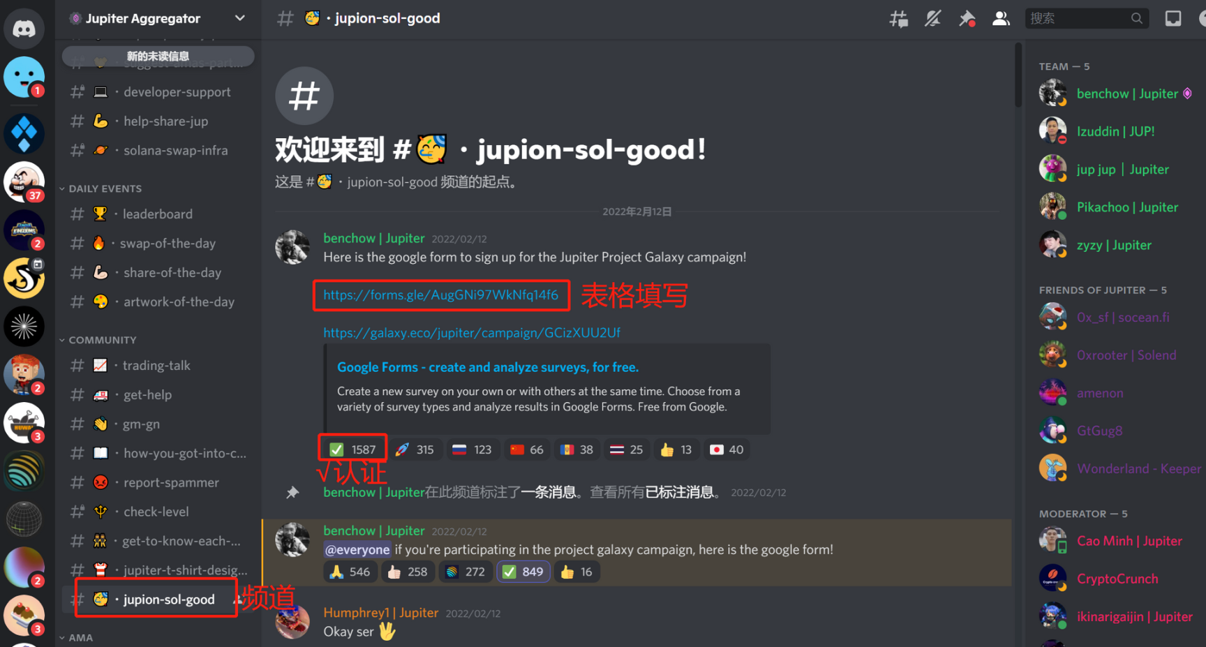 - 加入 Discord 社群 并且完成 Google 表格的填写,在 “jupion-sol-good” 频道中,然后用✅图标确认已完成任务