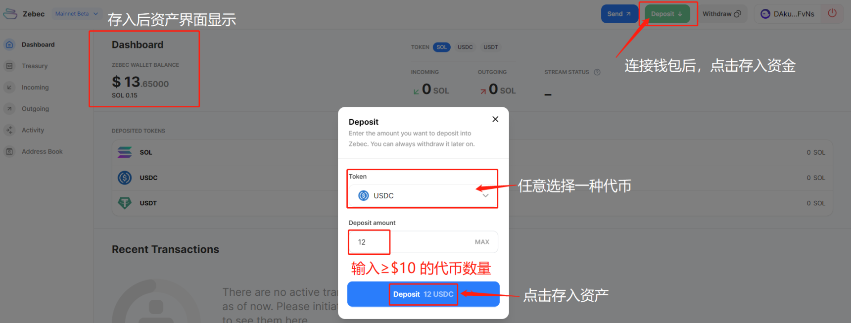 📌任务描述:在活动期间访问 Zebec 并连接钱包,存入并流通价值至少 10 美元的 \(SOL或\)USDC或$USDT。