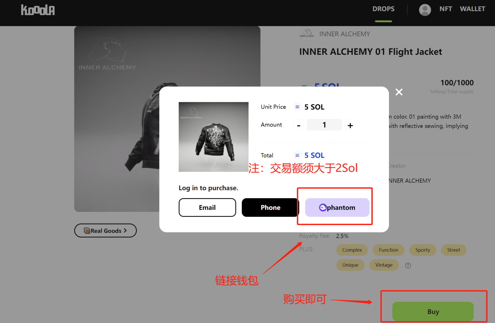- 在KOOOLA上购买数字街头服饰(单笔最低 2 SOL)https://kooola.io/#/drop