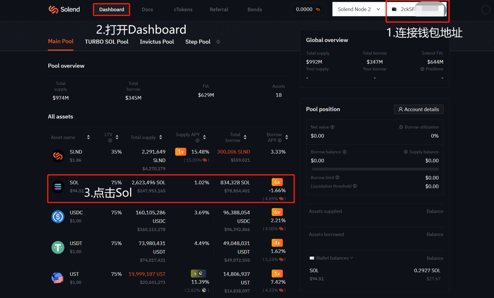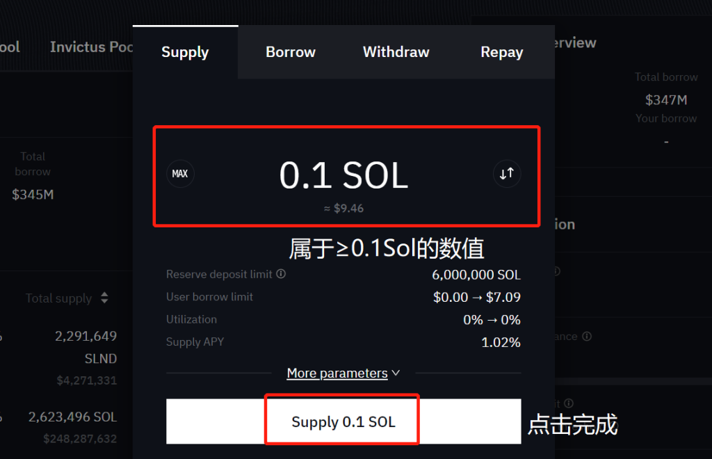 📌任务描述:活动期间在 Solend 平台上存入至少 0.1 SOL 并准确借出 $4.2069 美元。