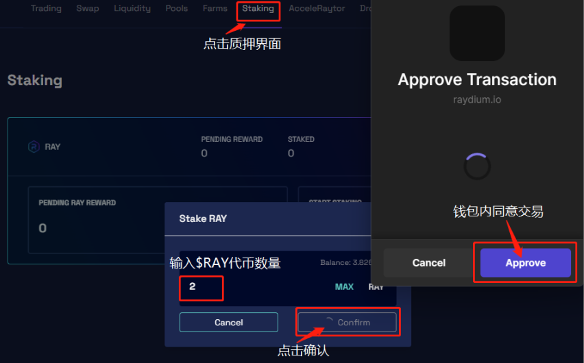首先点击页面上方的 “Staking” 质押界面,按照任务要求质押≥5美元的 \(RAY 代币(约等于2枚 \)RAY 代币)输入数量后点击确认质押,并在钱包内确认此笔交易。同样可在质押界面查看/领取 代币收益。