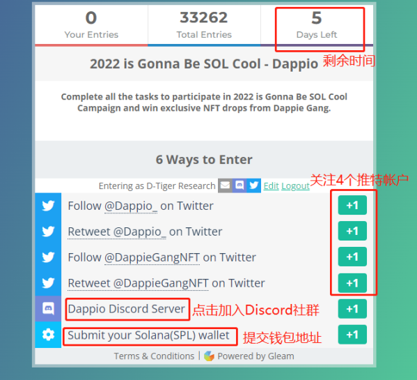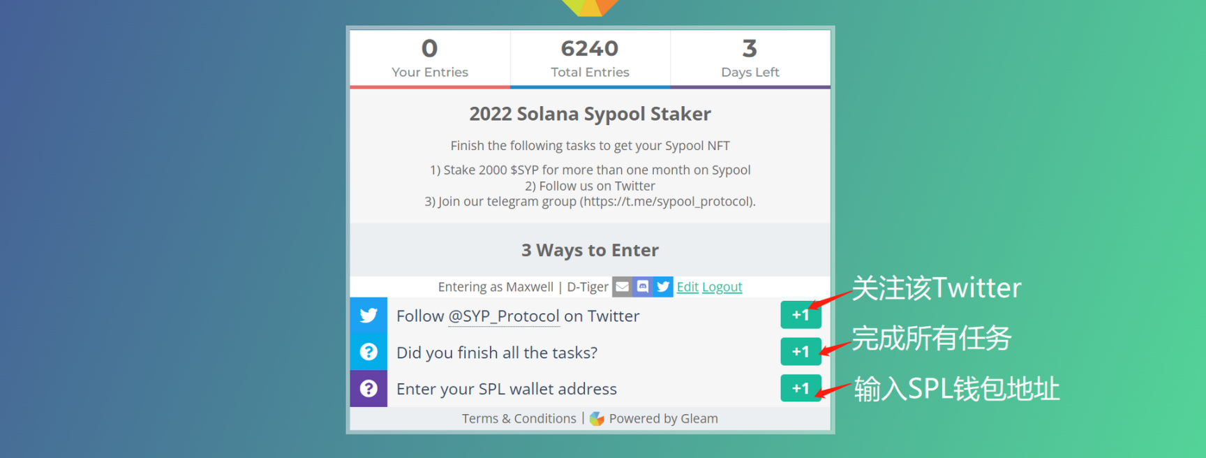 - 完成Gleam表单中的所有任务 (https://gleam.io/q39kb/solana-ecosystem-campaign-sypool-tasks)