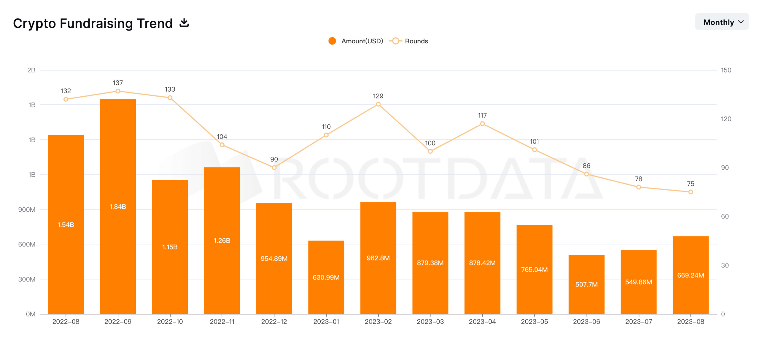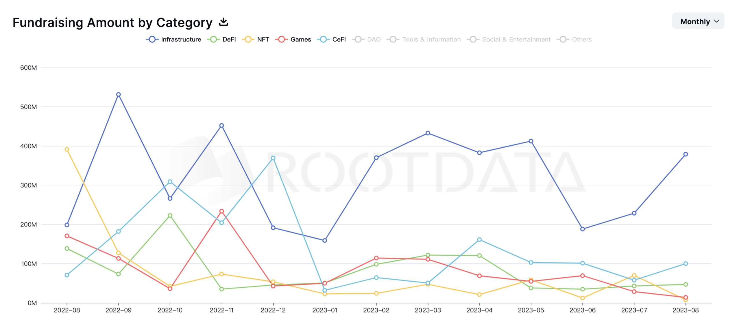 据 RootData 数据显示,2023 年 8 月加密市场融资金额为 6.62 亿美元,大部分领域融资数额较去年同时段相比有所下降。
