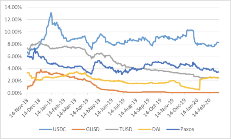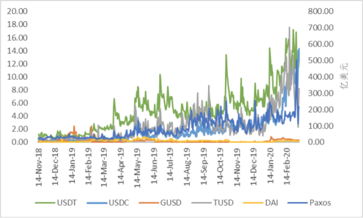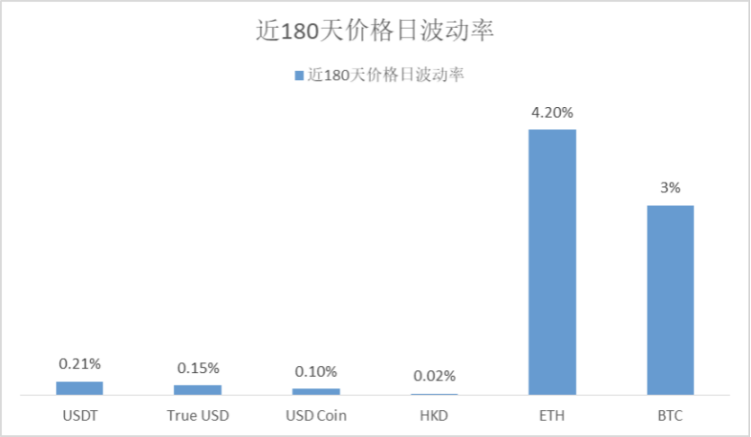 稳定币日均交易量以 USDT 为大宗,约占总额 95%。据 CoinMarketCap 资料,2020 年 3 月 9 日 24 小时交易量达到 547 亿美元。下图为市场交易量排名前六的稳定币历史交易量折线图,主坐标为 USDT 交易量,副坐标为其它稳定币交易量。可以发现两个现象 : 第一,自 2019 年底到 2020 年 3 月,稳定币日均交易量成长了 200%-300%。这个现象可以归因于比特币在这段期间上涨了 40%。第二,风险资产超额抵押型稳定币以 Dai 作为代表,交易量在 2019 年成长了约 300%,接近法币储备型稳定币 GUSD。目前市场上的法币储备支持型稳定币主要以美元作为锚定法币,如 USDT、TUSD、GUSD 及 USDC。下图为各稳定币及港币兑美元的日波动率。稳定币日波动率大约是港币美元货币兑的 5-10 倍,加密资产的 5%-10% 之间。虽然稳定币在加密资产生态已可作为价值存储或支付手段,但稳定币相比外汇货币兑的稳定性还是有所差距。图 7: 稳定币、港币及加密资产近 180 日美元价格日波动率 (%)从上述统计数据可以发现,合规的法币储备型稳定币逐渐成为 USDT 最大竞争对手。2019 年底,USDT 发行商 Tether 再度因为法币储备是否充足的问题陷入争议。争议围绕着 Tether 的偿债能力及流动性。Tether 已承认法币储备余额不足。与 Tether 不同的是,USDC 是由受监管的金融机构发行的。USDC 背后发行公司 Circle 拥有美国、英国和欧盟的支付牌照。USDC 透明安全的特点、多国监管的信用背书和更规范的财务审计机制都成为竞争亮点。USDT 传出法币储备不足后,自 2019 年 10 月至 2020 年 2 月,USDC 日均交易量上升了超过 500%。Paxos 和 TUSD 的交易量也上升了 300%。未来,我们可以预期在稳定币生态出现「一超多强」的竞争格局。尽管 Tether 频繁发生合规问题,USDT 还是占据市场主导地位。主要有两个原因:- 用户惯性。加密货币投资者本身对风险具有较高的容忍度。大部分用户更注重便捷性、流动性等操作体验。目前 USDT 为用户最主要法币入金管道,用户交易惯性强。