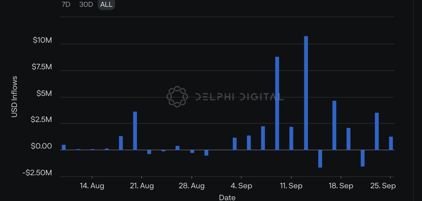 从每日美元流入来看,可以明显看出流入总体保持健康。在 2022 年 9 月 10 日周末达到峰值,TVL 在一天内增长了 50%。