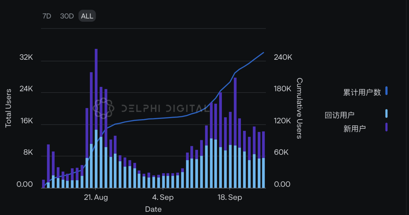与 TVL 和交易量一致,9 月初以来,用户活动也显着增长,这是对具有产品市场匹配的健康信号。FT 目前每天约有 1 万回访用户,上周平均每天有 9 万新用户。