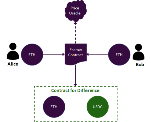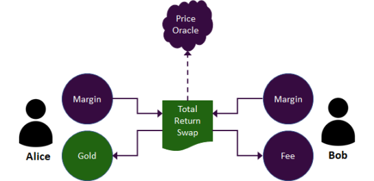 上图中的智能合约包含 Alice 和 Bob 之间的双边协议的经济条款、终止条款和保证金要求。它还需要一个价格数据预言机来返回基础参考资产的当前价格。