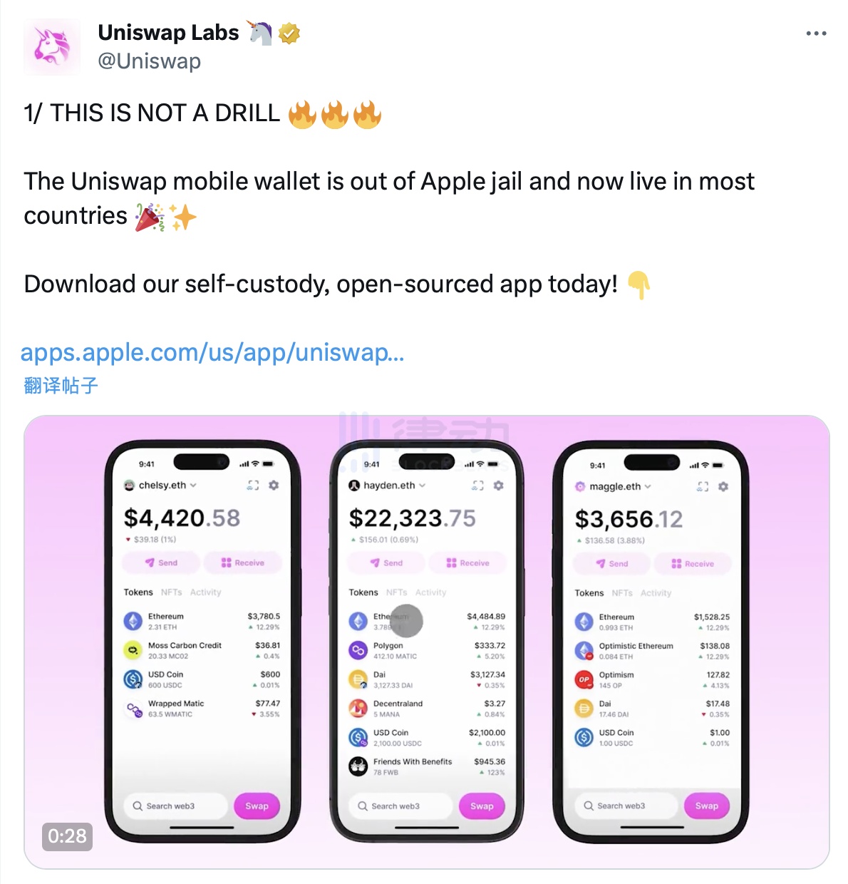 4 月 13 日,Uniswap 宣布,其移动端钱包已上架大多数国家 / 地区的 App Store。该钱包支持用户在以太坊主网、Polygon、Arbitrum 和 Optimism 上交易,交易费用为 2.55%,其它功能包括使用 WalletConnect 连接、查看 NFT、推送通知等。