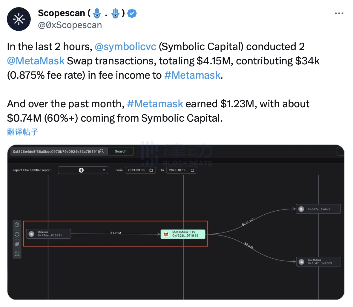 BlockBeats 消息,10 月 13 日,据 Scopescan 监测,Symbolic Capital 过去的 2 个小时通过 Metamask 进行了 2 笔交易,总额达 415 万美元,为 Metamask 贡献了 3.4 万美元手续费收入(费率 0.875%)。在过去的一个月里,Metamask 赚取了 123 万美元手续费收入,其中约 74 万美元(约 60%)来自 Symbolic Capital。