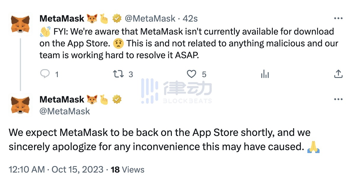 MetaMask 官方表示,「我们知道 MetaMask 目前无法在 App Store 上下载。这与任何恶意行为无关,我们的团队正在努力尽快解决它。预计 MetaMask 很快就会重新出现在 App Store 上,对于由此造成的任何不便。MetaMask 仍可在 Google Play 上使用。」数小时后,应用重新上架。