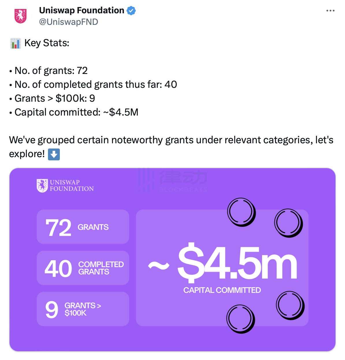9 月 20 日,Uniswap 基金会宣布自其接管 Uniswap 激励计划一年以来,该计划已取得显著成果。至今,基金会已发放了 72 项资助,其中 40 项已完成。9 项资助金额超过 10 万美元,总资金承诺约为 450 万美元。