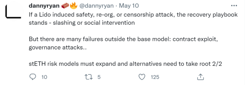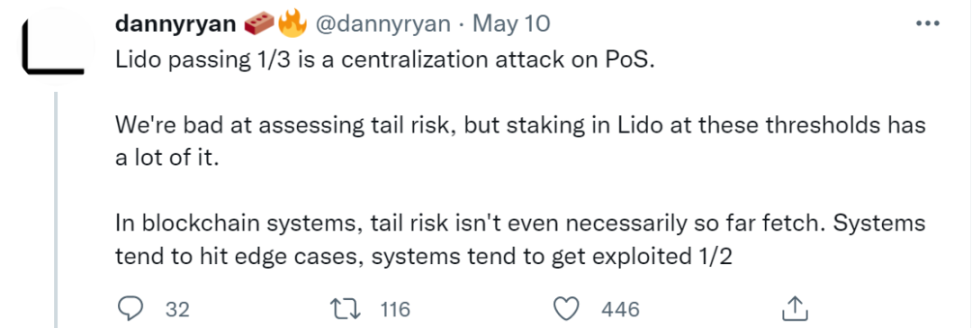 5 月 10 日,以太坊基金会的研究员 Danny Ryan 指出,Lido 的验证者占比超过 1/3 对 PoS 来说是一个中心化攻击。