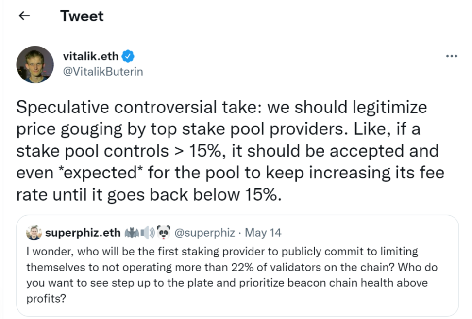 这是一个可能有争议性的观点:我们应该允许头部质押池提供商哄抬价格。比如,如果一个质押池控制了超过15%的质押者,该质押池一直提高它的费用率直到它的占比下跌到低于 15%,这种做法应该是可以被接受,甚至被预期的。