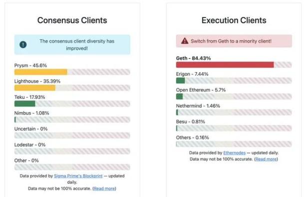 目前的客户端分布,Geth 占主导的情况还是非常严重,如果 Geth 出现漏洞可能会引发大型罚没事件。