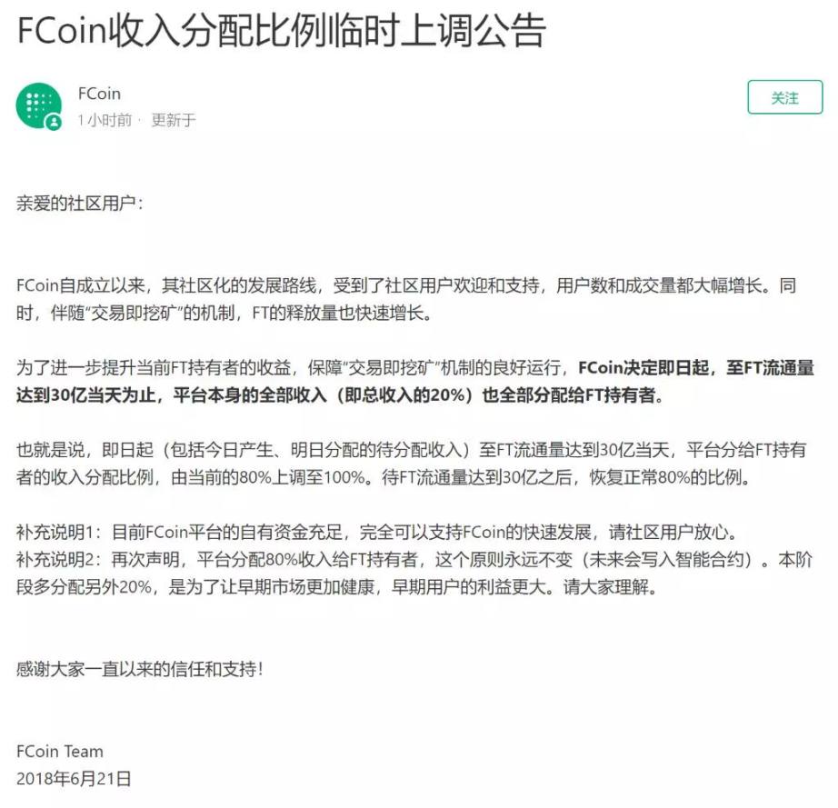为了进一步提升当前 FT 持有者的收益,保障「交易即挖矿」机制的良好运行,FCoin 决定即日起,至 FT 流通量达到 30 亿当天为止,平台本身的全部收入 即总收入的 20% 也全部分配给 FT 持有者。