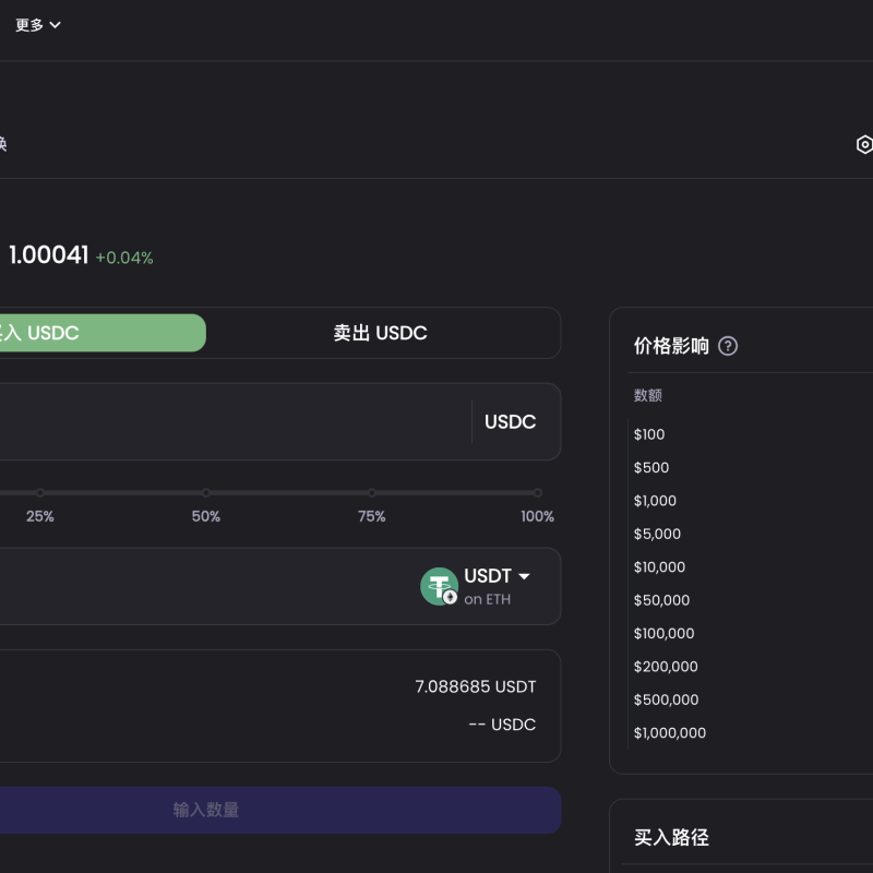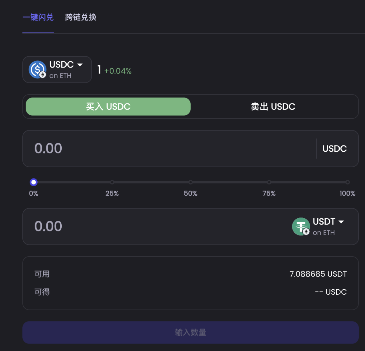 Swap V2.0 不仅实现了买入卖出方自由选择不同链的稳定币。同时,在兑换金额的进度条上,还有拉取点击交互设计,直观展示用户所偏好的进度条中的视觉效果,无论用户是否有足够的金额,都可以产生预价结果。当用户无相关金额,选择进度条时,输入框中的数据保持不变;当用户有相关金额,选择进度条时,输入框中的数据则产生相应的变化。