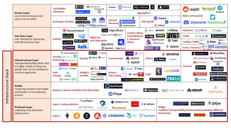 世界继续转向 Web 3.0 ,而目前全世界只有 0.71%² 的人在使用区块链技术,去中心化的基础设施堆栈将有助于确保主流大众而不仅仅是区块链「创新者」¹加入 Web 3.0 的世界。无论是供应链管理(Scantrust)、气候变化(Klima)、内容发布(Mirror)、创收(Axie Infinity)还是海外援助(乌克兰DAO)等等,去中心化技术的新用例不断出现。抛开围绕着个人对中心化权威机构(如政府或大型 Web 2.0 捍卫者)的挫败感和低信任度展开的辩论,大部分人选择投入 Web 3.0 是出于功利的目的,而不是出于意识形态的转变。这进一步说明了建立去中心化的基础设施堆栈的重要性,它为 Web 3.0 提供动力,使其成为一个可靠的替代方案,获得开发者和用户的信任。