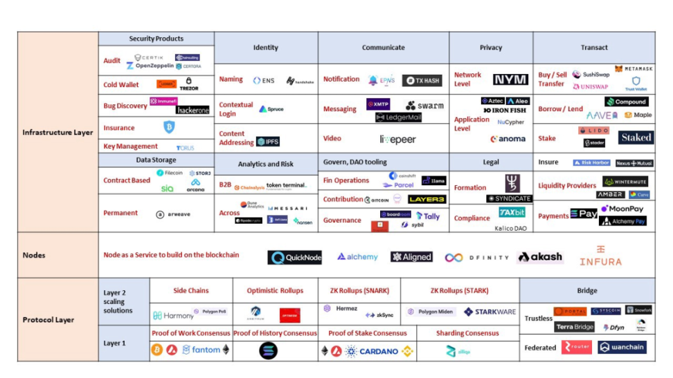 基础设施堆栈在网络、计算、存储、安全、分析、治理和交易方面提供了类似乐高的支柱,这些都是可组合的,足以使应用程序能够跨多个用例构建,通常超出 Web 2.0 世界的可能性范围。